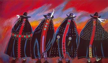 Apolonia had a wonderful sense of humor. Rodeo Sisters depicts Native Women dressed in finery to go dancing. She intended the pronunciation to be (Ro-day-0), indicating the Native Women were as well dressed as Women who shop on Rodeo Drive.